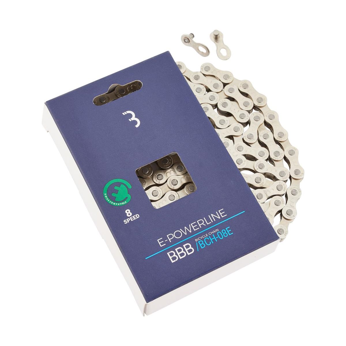Robusti BBB E-PowerLine Chain BCH-08E on vankka ja luotettava 8-osaisiin kasetteihin soveltuva ketju, joka on kehitetty sähköpyörille. Ketju muodostaa yhteyden alustan ja voimasi välille, muuntaen jalkojesi voiman suoraan oikeaan nopeuteen! Vahva ja erityisen kestävä BBB E-PowerLine ketju vastaa sähköpyörien standardeja (NEN-EN 15194:2017).