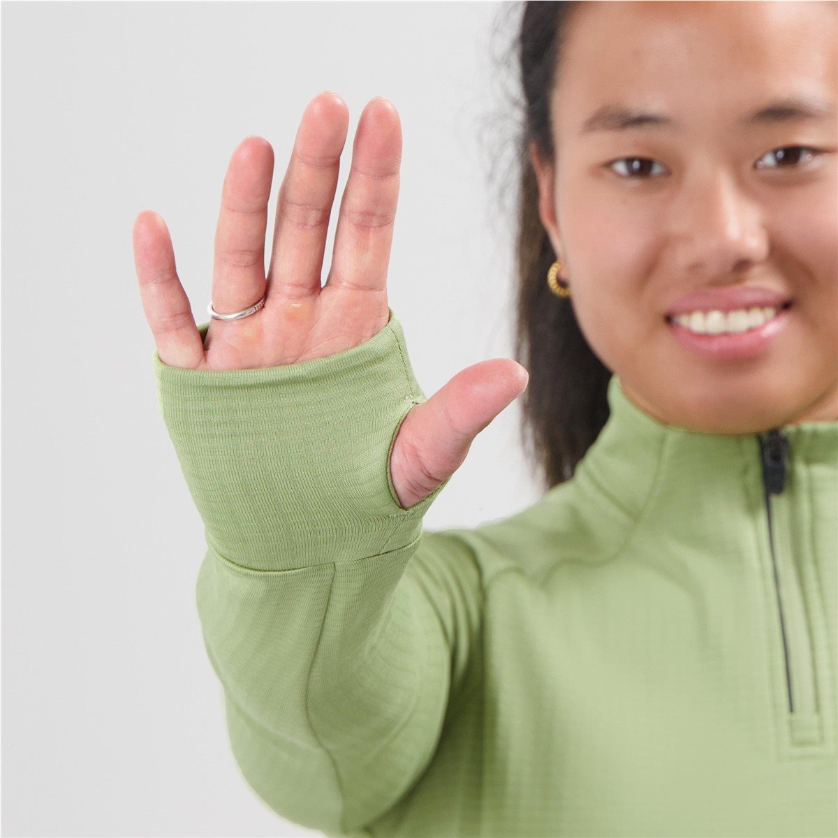 Lyhyt vetoketju edessä mahdollistaa helpon ilmanvaihdon juoksun aikana, kun taas peukalonreiät hihoissa antavat lisäsuojaa ja auttavat pitämään hihat paikoillaan. Heijastavat yksityiskohdat parantavat näkyvyyttä aikaisilla aamu- tai iltalenkeillä.