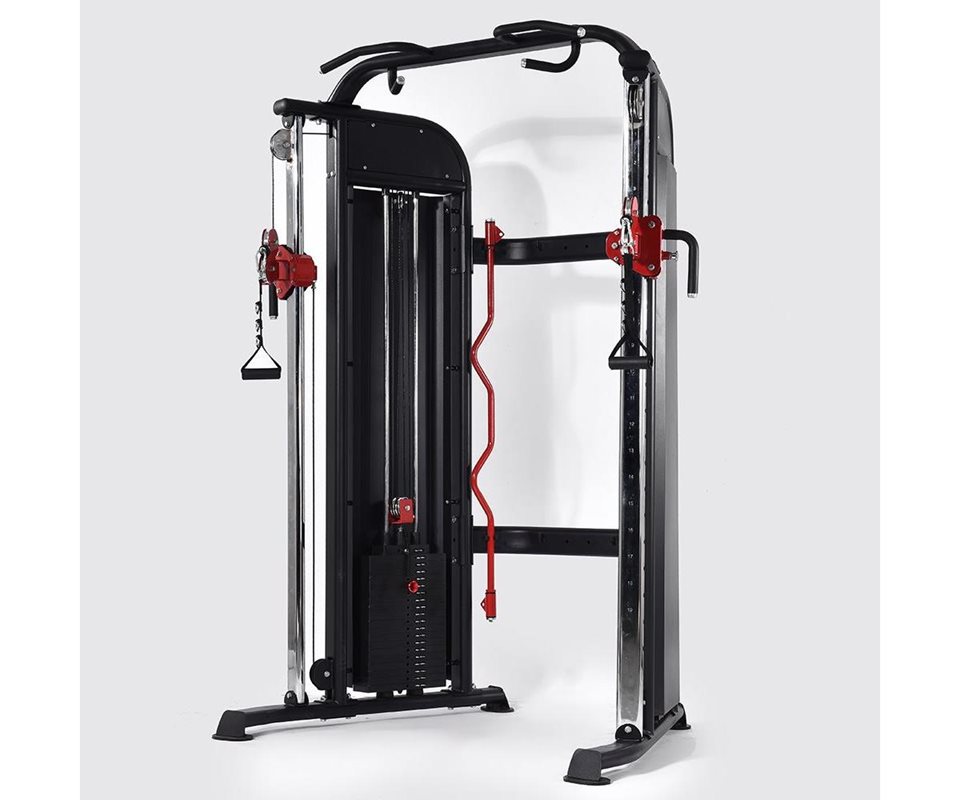 Kuntokeskus, joka toimii loistavasti myös kuntosaleissa ja suuremmissa harjoitustiloissa. A lumiiniset pylpyrät takaavat pitkän käyttöiän. Jokainen painokasetti koostuu 6 kg painolohkoista ja lohkoja on yhteensä 20 kummallakin puolella. Helppo yhden käden korkeudensäätö.