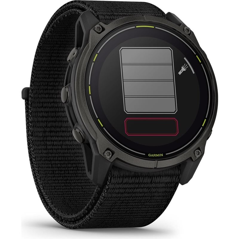 Korkealuokkainen Garmin Enduro 3 on kestävä, sofistikoitu ja kevyt (63 grammaa) treenikello, jonka isossa näytössä on aurinkolataus 51 mm titaanikehyksellä ja naarmuuntumattomalla safiirilasilla. Aurinkolataus antaa lisävirtaa käytettäessä GPS:ää, joten älykellosi akku kestää pidempään kuin seuraava ultrakilpailusi. Lisäksi saat energiatehokkaan paikkatarkkuuden ja sisäänrakennetut kartat, jotka auttavat sinua löytämään perille. Saat jopa 36 päivän akunkeston älykellotilassa – ja 54 lisäpäivää aurinkolatauksella – täydelliseen terveyden ja kunnon seurantaan sekä enintään 320 tuntia GPS-tilassa aurinkolatauksella, jotta voit seurata treeni- ja kilpaurheilutuloksiasi. Valaise seikkailusi sisäänrakennetulla LED-taskulampulla, jossa on erilaisia kirkkauksia ja punainen turvavalo, jotta pysyt valppaana treenatessasi pimeässä. Kellosta löytyy myös maastojuoksun erikoistoimintoja, kuten VO2 Max, kaltevuuden mukautuva tempo ja NextFork-karttaopastus, ja se on suunniteltu auttamaan sinua selviytymään haastavimmista maastoretkistä ja -kilpailuista. Paranna kehosi suorituskykyä kohdennetuilla voimaharjoitteluohjelmilla, reaaliaikaisella kestävyyden seurannalla, erityisillä treeniohjelmilla eri aktiviteettityypeille ja laajalla valikoimalla sisäänrakennettuja urheilusovelluksia, jotka on räätälöity ultrajuoksijoille, pyöräilijöille, vaeltajille ja muille.