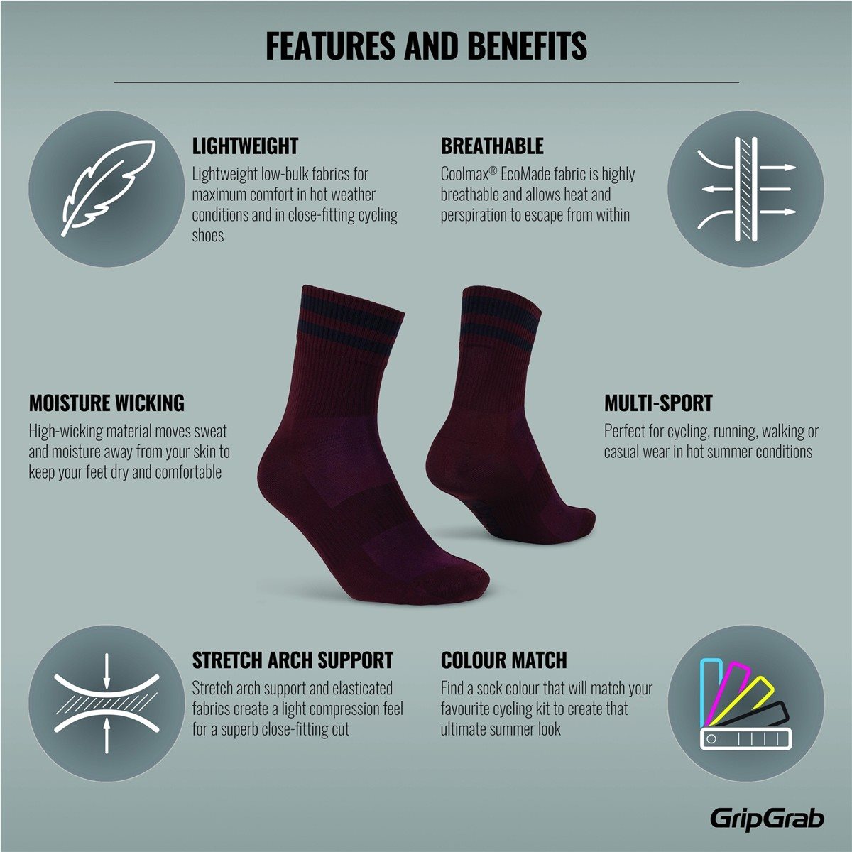 Suositut GripGrab Original Stripes Crew Socks ovat vaikuttavan mukavat pyöräilysukat perinteisellä Cuff-pituudella, jotka sopivat useimpiin olosuhteisiin. Sukat on valmistettu hengittävästä ja pehmeästä materiaalista, jolla on korkea kulutuskestävyys, mikä tekee niistä sopivat useimpiin käyttötarkoituksiin. Joustavat paneelit tarjoavat erityisen tehokkaan tuuletuksen, ja kiitos kunnollisten vahvistusten sekä varvasosassa että kantaosassa, sukat tarjoavat ensiluokkaista mukavuutta pitkään tulevaisuudessa. Sukat valmistetaan lisäksi monissa eri väreissä, joten varmasti löytyy jokin, joka sopii juuri sinun asuusi.