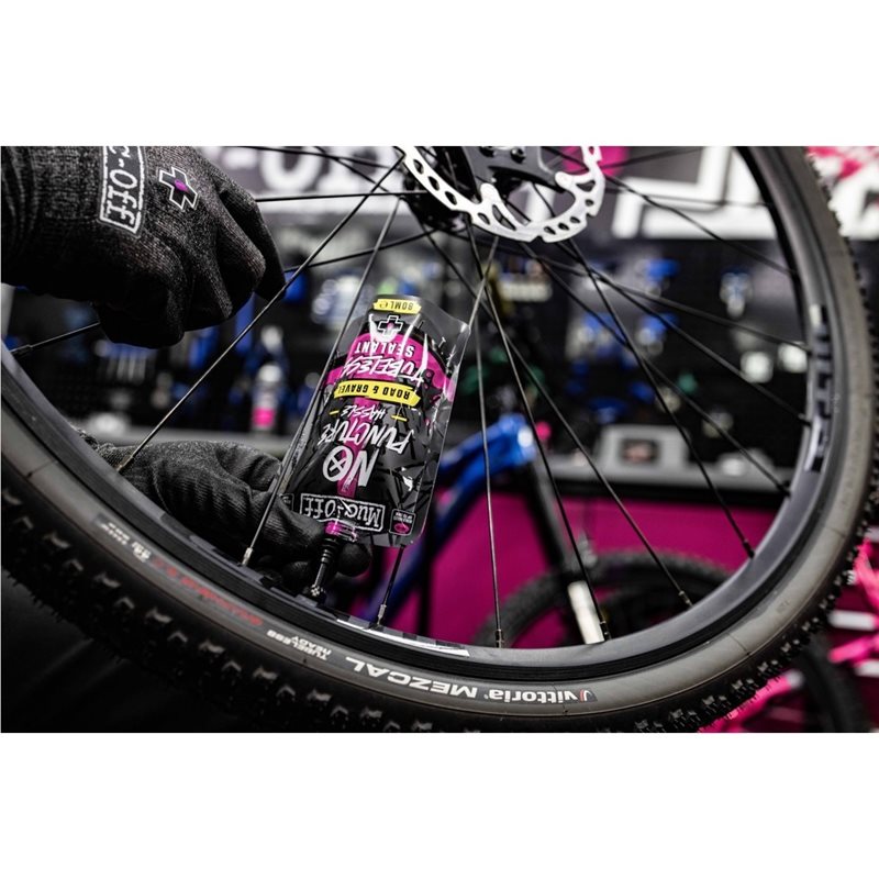 Muc-Off Road & Gravel Tubeless Sealant on maantie- ja gravelpyöriin suunniteltu tubeless-litku. Synteettisestä lateksista ja biohajoavista tiivistyspartikkeleista koostuvan seoksen ominaisuudet on optimoitu kapeammille renkaille ja korkeammille rengaspaineille. Tiivistää tehokkaasti jopa halkaisijaltaan 7mm reiät ja säilyttää ominaisuutensa renkaan sisällä 3-6kk. Myrkytön ja allergisoimaton koostumus. Toimii myös CO2-patruunoiden kanssa.