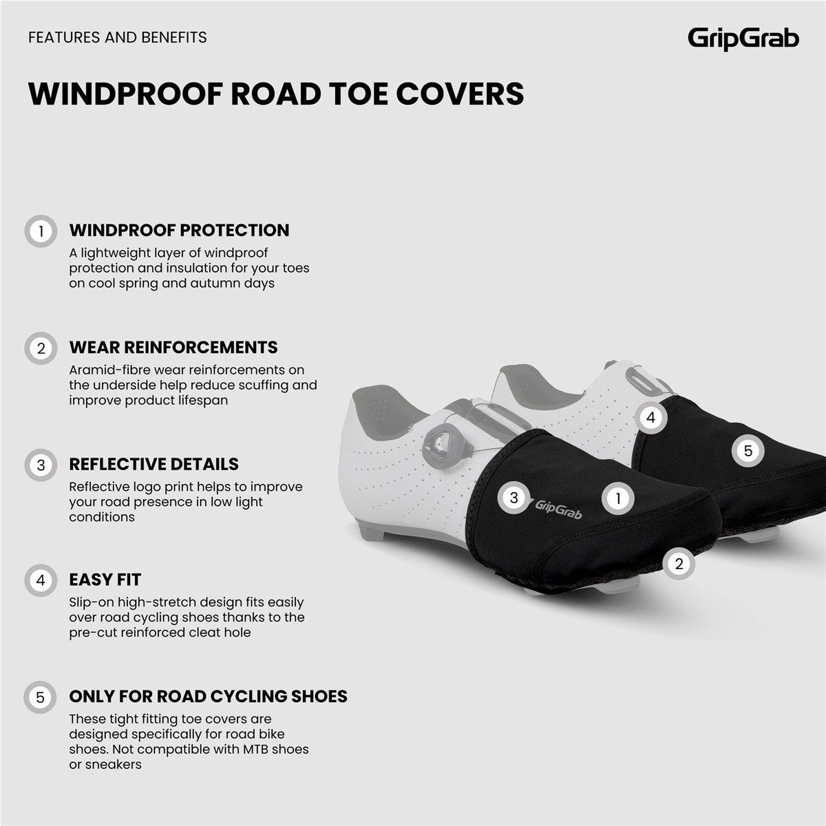 GripGrab Toe Cover on sekä tuulenpitävä että vedenpitävä, ihanteellinen kevät- ja syksypyöräilyyn sekä yhteensopiva useimpien polkinjärjestelmien kanssa. Varvassuojus on valmistettu tuulenpitävästä materiaalista tarjoten lisälämpöä pyöräilyretkillä vaihtelevissa sääolosuhteissa. Suojukset ovat myös helpot ja nopeat pukea päälle - vedä ne vain kenkiesi päälle ja ne suojaavat varpaasi kylmältä, ja ne mahtuvat myös selkätaskuusi kun niitä ei tarvita.
