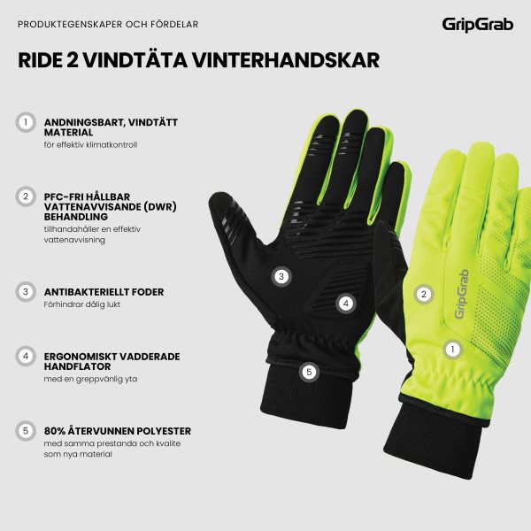 Nämä hanskat sisältävät 80% kierrätettyä polyesteriä, mikä heijastaa GripGrabin sitoutumista vastuullisiin hankintoihin säilyttäen samalla korkeat suorituskyvyn ja kestävyyden standardit. Korota talvipyöräilykokemustaasi RIDE 2 Tuulenpitävillä talvihanskoilla, joissa hinta-laatusuhde kohtaa laadun ja toiminnallisuuden – täydellisiä viileisiin, tuulisiin päiviin pyörän selässä.
