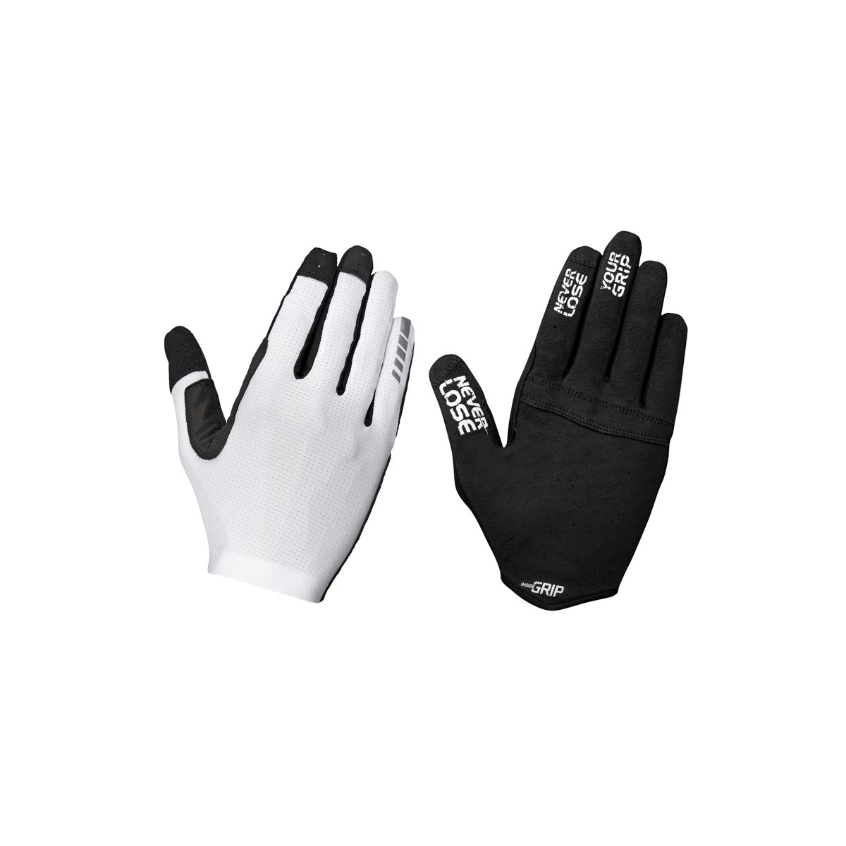 Ammattilaispyöräilijöiden palautteen pohjalta olemme kehittäneet käsineen, joka mahdollistaa pitkäsormisten käsineiden etujen hyödyntämisen jopa kuumimmissa olosuhteissa. Kevyitä, ilmavia ja erittäin joustavia materiaaleja käyttämällä olemme onnistuneet lähestymään tunnetta, jossa kädessä ei olisi käsineitä ollenkaan. Painon pitämiseksi alhaisena ja ohjaustuntuman maksimoimiseksi näissä käsineissä ei ole geelivahvistusta. Aerolite-käsineessä on GripGrab:in InsideGrip™ teknologia, jossa silikonitekstuuri käsineen sisäpuolella kämmenessä, peukalossa, etu- ja keskisormessa luo lyömättömän pidon käden ja käsineen välille, antaen toisen ihon tunnun käsineen sijaan. Voit tietenkin myös käyttää Pyöräilytietokoneettasi tai matkapuhelintasi ottamatta käsineitä pois kiitos kosketusnäyttöyhteensopivan peukalon ja etusormen. Nämä Maastopyörä-pitkäsormiset käsineet tarjoavat lyömätöntä pitoa, hengittävyyttä ja ohjaustuntumaa kuumissa olosuhteissa. Valmis vaihtamaan seuraavalle vaihteelle seuraavassa kilpailussa!