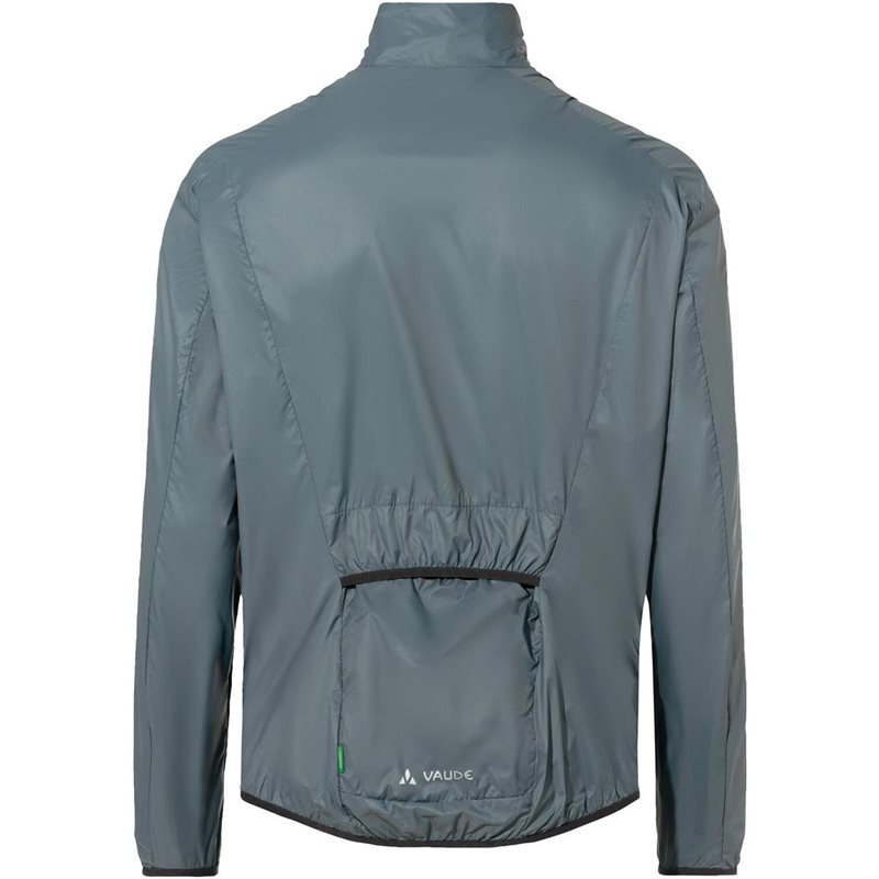 Tuulitakki on valmistettu 100% kierrätetystä polyesteristä ja siinä on Vaude´n PFC-vapaa vettä- ja likaa hylkivä Eco Finish, joka on sekä nopeasti kuivuva että hengittävä. Takana on avoin tasku, johon voit säilöä kompaktin takin, kun sitä ei tarvita.