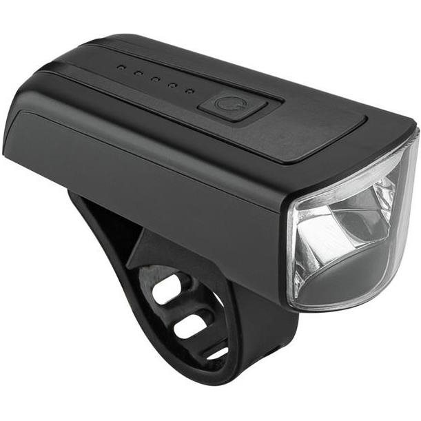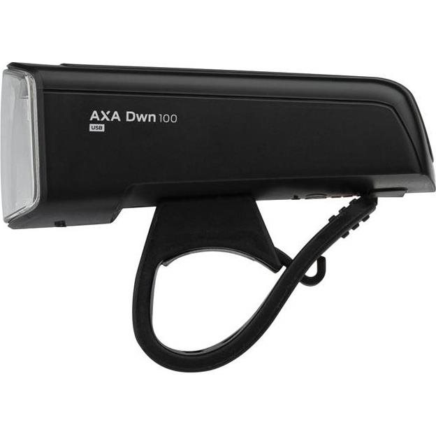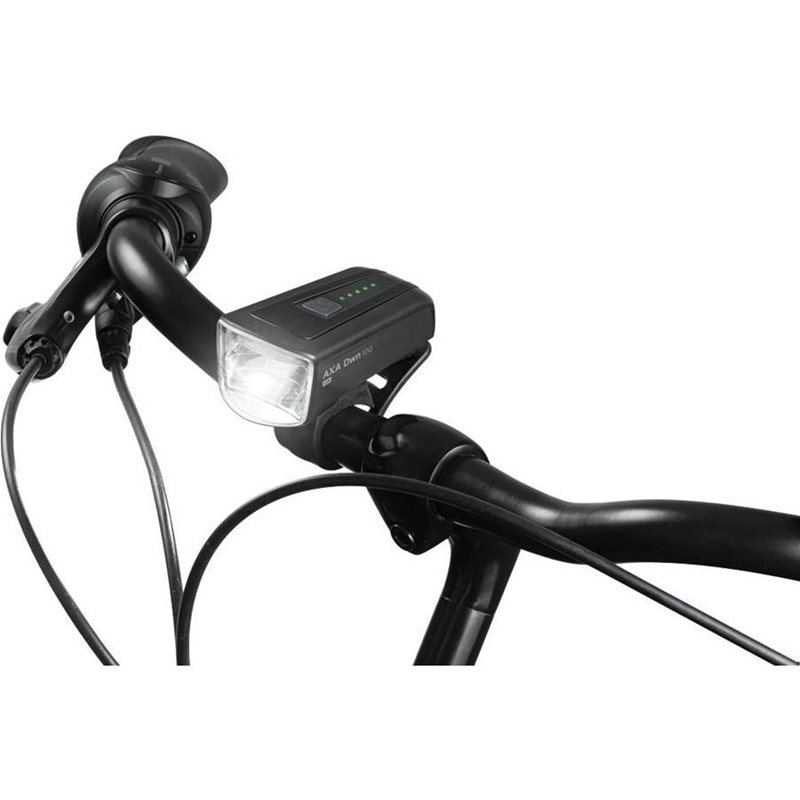 Axa Dwn 100 USB-ladattava StVZO-hyväksytty polkupyörän etuvalo. Valaistusvoimakkuus maksimiteholla 100lux. Kompakti pikakiinnitteinen tehokas valo, joka kiinnitetään tukevalla silikonipannalla ohjaustankoon. Sopii kaikkiin ohjaustankoihin, joiden paksuus on 22 - 35mm. Valossa on tyylikäs suojaava alumiinirunko ja USB-C -ladattava sisäinen akku. Viisitasoinen akun varaustilan indikaattori kertoo paljonko akussa on virtaa jäljellä (5 lediä < 100%, 4 lediä < 80%, 3 lediä < 60%, 2 lediä < 40%, punainen led < 20%). StVZO-hyväksytyt valot täyttävät Saksan tieliikennelainsäädännön vaatimukset - niiden valokeila on rajattu ja kohdistettu enemmän kohti tien pintaa, joten ne eivät häikäise vastaantulijoita.