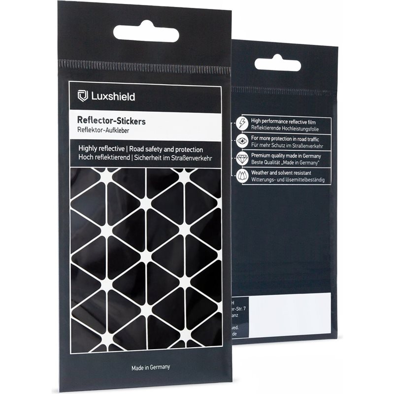 Luxshield Heijastava Tarrat-Triangles Black ovat mustia heijastavia tarroja kolmiomuodossa, jotka lisäävät näkyvyyttä ja turvallisuutta pyöräillessä pimeässä.
