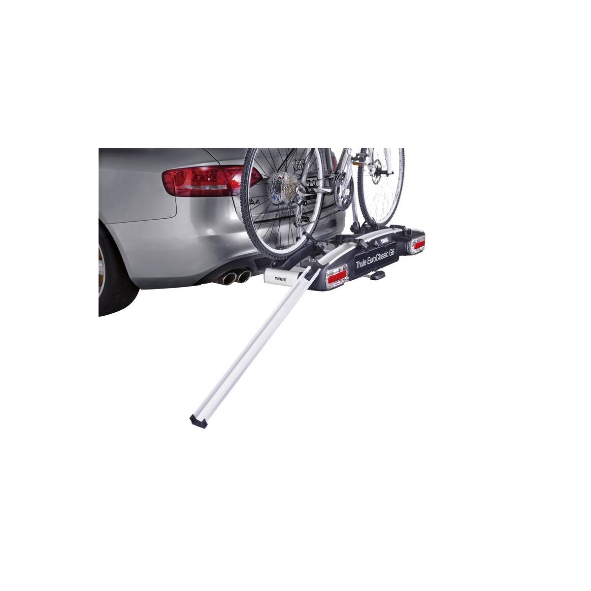 Thule Lastramp 9152 on kätevä lastausramppi, joka tekee polkupyörien lastaamisesta ja purkamisesta autolle helpompaa. Rullaamalla pyörän suoraan telineeseen vältät raskaiden nostojen aiheuttaman rasituksen ja säästät selkääsi. Sopii Thule EasyFold, EuroPower, EuroClassic G6 ja VeloCompact -mallien kanssa. Esiasennettu puristin, joka kiinnittyy pyörätelineeseen, pitää rampin paikoillaan ajon aikana (vain Thule EuroPower).