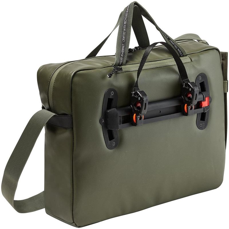 Muunneltava laukku VAUDE Mineo Commuter Briefcase 17 yhdistää salkun ja pyörälaukun saumattomasti, ja sen saa kiinnitettyä sekä irrotettua pakettitelineestä vaivattomasti. Se soveltuu täydellisesti päivittäiseen työmatkapyöräilyyn, mutta on myös mukava kantaa kävellessä – kiinnityskisko piiloutuu kätevästi sivutaskuun. Puhelin ja muut pienet tavarat pysyvät suojassa vetoketjullisessa takataskussa, lehdet, muistikirjat ja eväät kulkevat helposti etutaskussa, ja tilavassa päälokerossa on tilaa 15,6 tuuman kannettavalle tietokoneelle, asiakirjoille ja jopa kokonaiselle kansiolle. Sisäinen juomapullotasku pitää juomat paikallaan, ja kynät sekä avaimet pysyvät järjestyksessä omissa lokeroissaan.