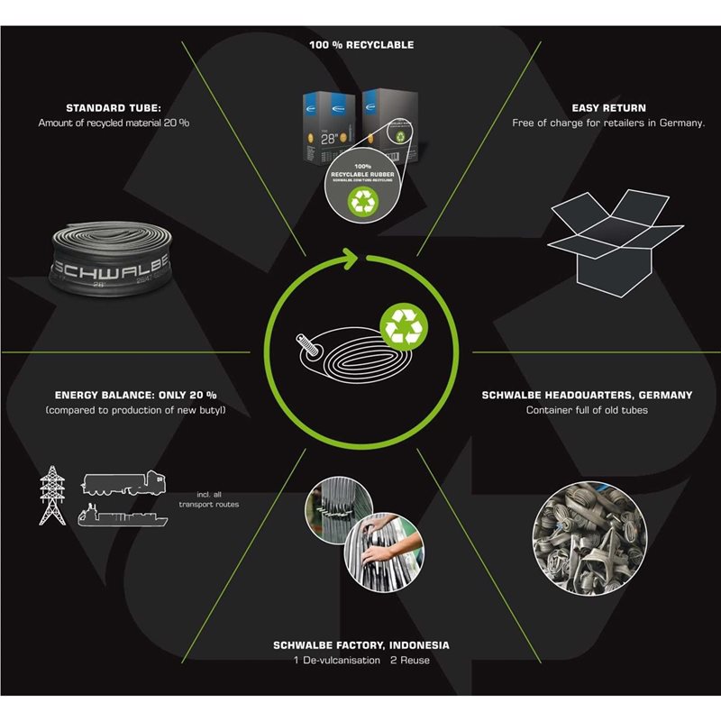 Korkealaatuinen sisärengas saksalaiselta Schwalbelta on ympäristöystävällisesti tuotettu ja pitää useimmiten ilman pidempään kuin kilpailijoiden tuottamat sisärenkaat. Tämä saavutetaan käyttämällä erittäin puhdasta kumiseosta ja valmistusmenetelmää, joka tuottaa vaikuttavan tasaisen seinämävahvuuden.