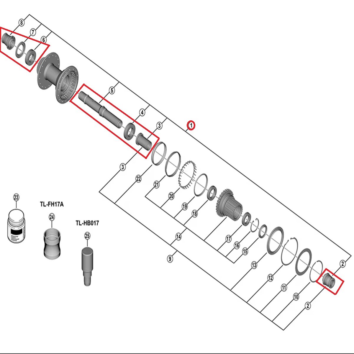 Täydellinen taka-akseli FH-M8210-B-napaan — varaosa pyörän kokoamiseen tai korjaukseen.