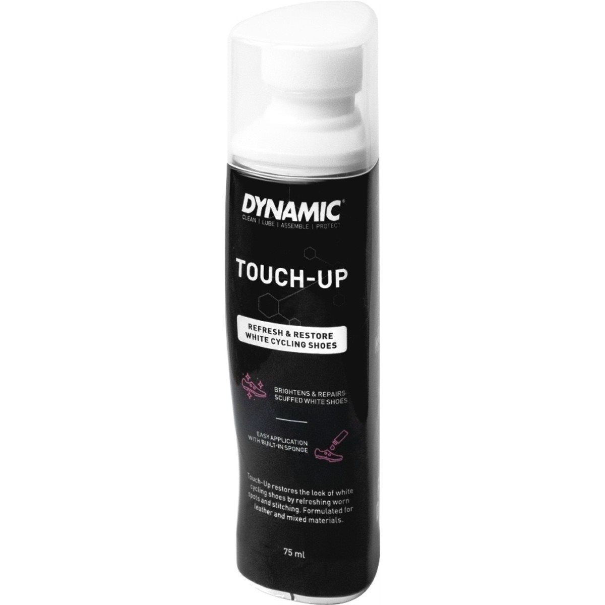 Dynamic Bike Care Touch Up Shoe Cleaner tekee pyöräilykengistäsi taas valkoiset ja raikkaantuneensa! Tuote on erityisesti kehitetty valkoisten pyöräilykenkien virkistämiseen ja ennallistamiseen, ja se toimii nahan, synteettisten ja sekamateriaalien kanssa.