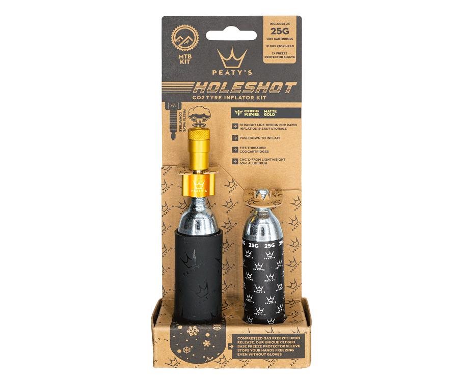 Holeshot CO2-renkaiden täyttölaite on valmistettu CNC-koneistetusta 6061-alumiinista ja siinä on patentoidussa suunnittelussa oleva venttiili. Suuttimessa on tarkkaan harkitut yksityiskohdat, kuten korkealaatuisesta kumista valmistetut o-renkaat, kaikki kiedottuna Chris Kingin tunnusomaisiin anodisoituihin väreihin.