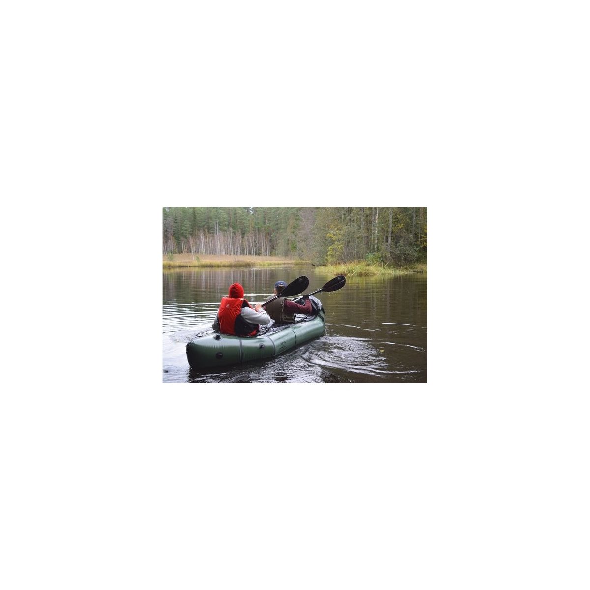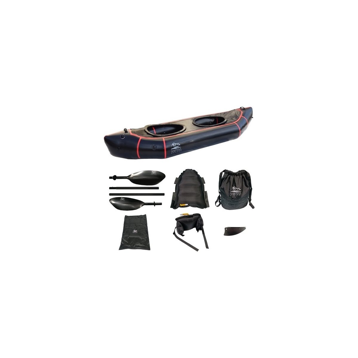 Paketti sisältää kaiken tarvittavan: kaksi melaa, ilmapenkin selkänojalla, evän, pumpsäkin packraftin täyttämiseen, säilytyslaukun, korjausmateriaalit, irrotettavan spraydeckin ja kaksi erillistä kapellia.